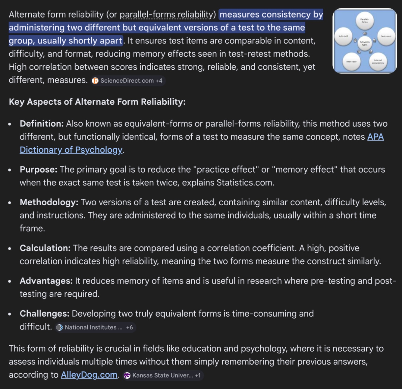 Split-half reliability is a measure of internal consistency in which a test is divided into two comparable halves and the correlation between the two sets of scores is calculated; Cronbach’s alpha reflects the average inter-item correlation and indicates how consistently the test items measure the same construct.