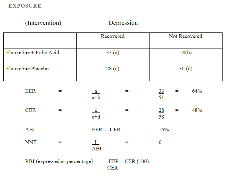 You run an RCT in depression: everyone gets fluoxetine, but half also get folic acid. Recovery is 64% with folic acid vs 48% with placebo, so ABI is 16% and NNT is about 6–7—meaning for every ~6–7 people you add folic acid to, one additional person recovers.