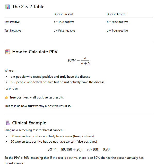 👉 “If the test says someone has the disease, how likely is it that they really do?”