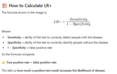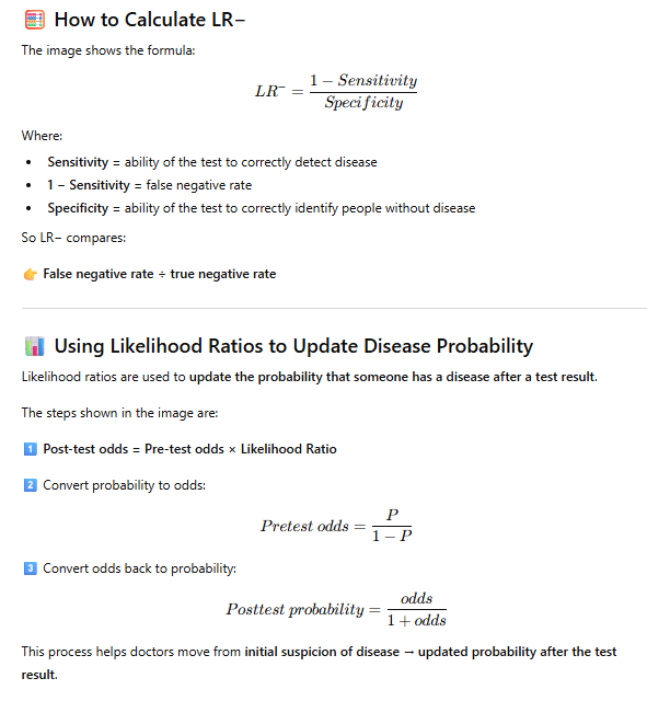 👉 Post-test probability = the final chance a patient has the disease after considering the test result.