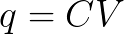 What is the equation relating stored charge(q), capacitance(C) and voltage(V) in a capacitor?