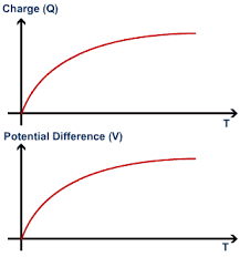 When a capacitor is uncharged it is initially easy to add electrons onto the first plate. (so charge increases quickly)