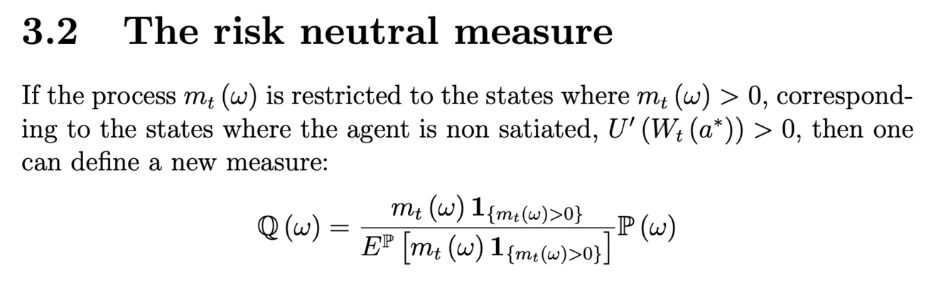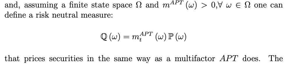 Sono due modi di valutazione che danno risultati equivalenti e uno può essere scritto in funzione dell’altro. Nel particolare si passa dalla valutazione APT (fatta con probabilità P) a quella fatta con probabilità Q aggiustando le probabilità P per il price kernel.