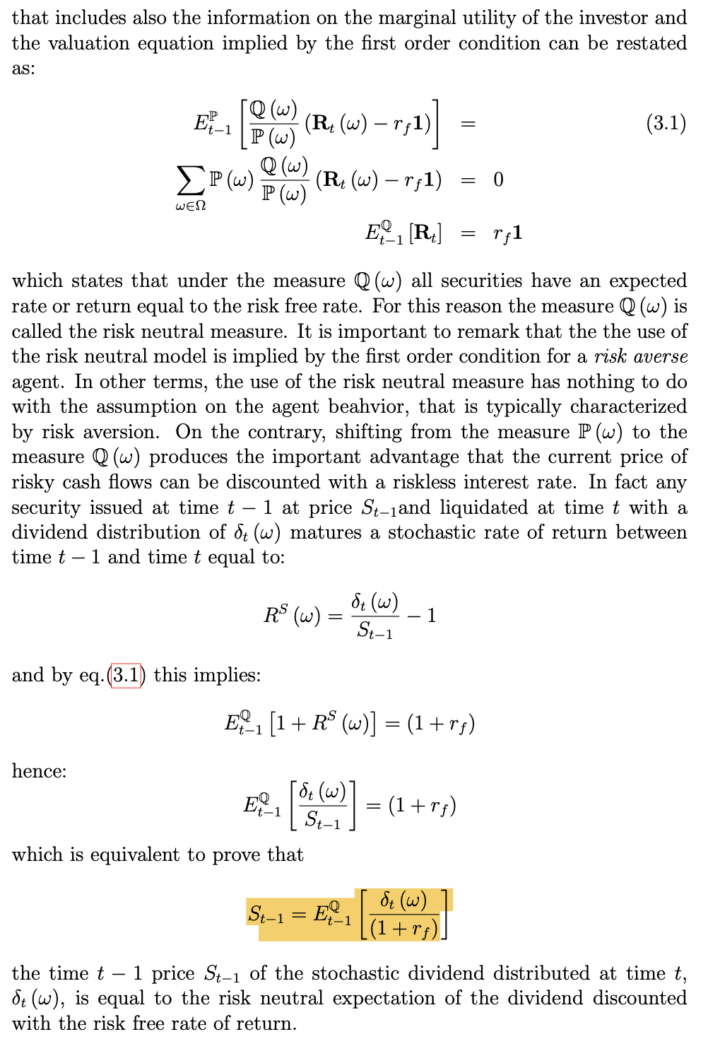Tramite manipolazioni matematiche, si può arrivare al risultato che il prezzo oggi sia uguale alla risk neutral expectation del dividendo scontato al tasso risk-free