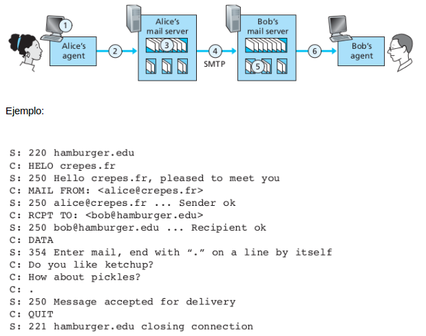 Es el principal protocolo de capa de aplicación para el correo electrónico. SMTP transfiere mensajes desde el servidor de correo de origen al servidor de correo del receptor. Utiliza conexiones persistentes.