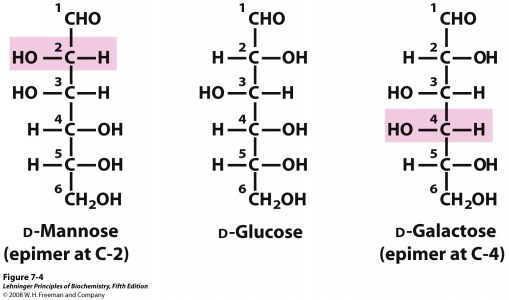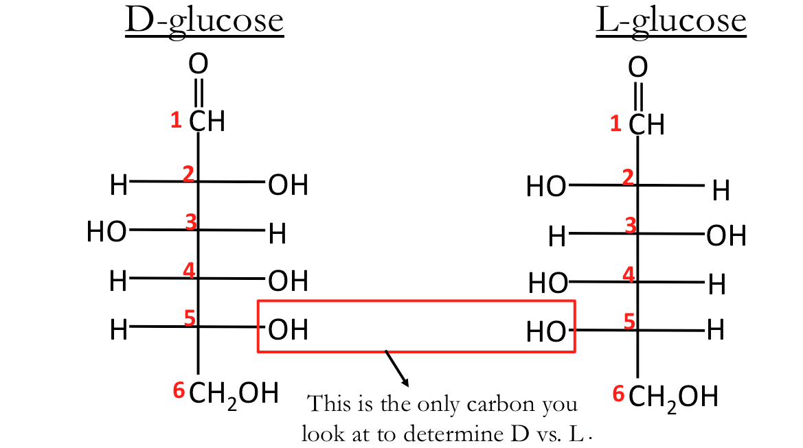 Last chiral carbon furthest away from the aldehyde or ketone group.