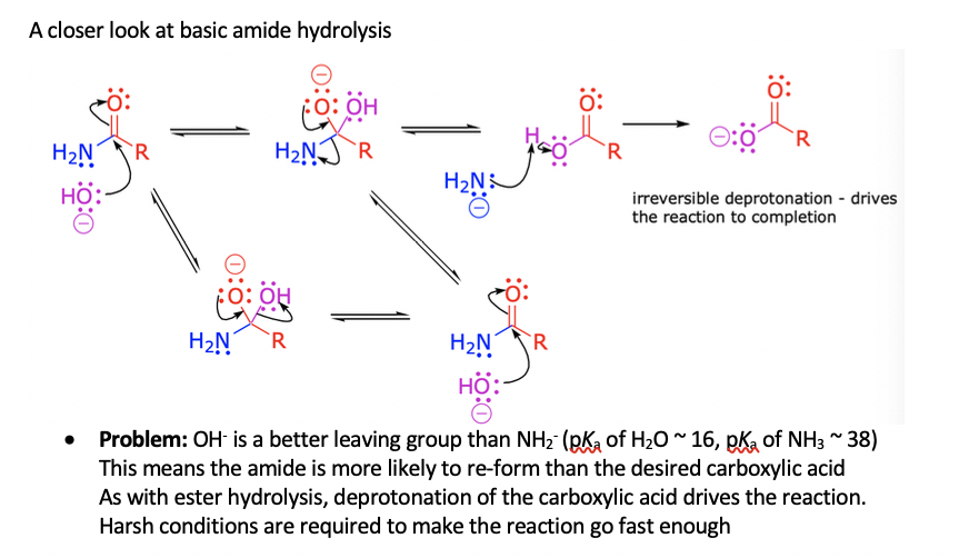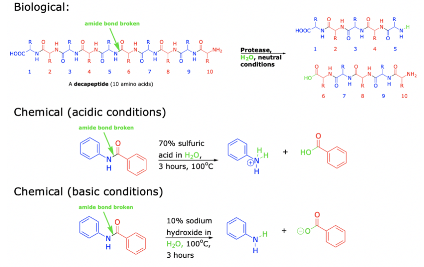 Compare amide hydrolysis in biological and chemical processes (acidic and basic)