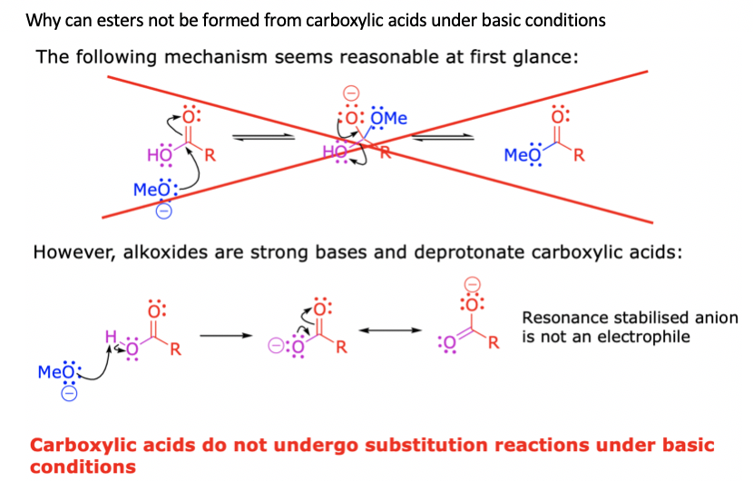 Why can’t esters be formed from carboxylic acids under basic conditions?