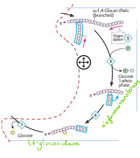 deficiency debranching enz = shorter + more frequent glycogen branches = too much storage glycogen in liver = can’t be broken down to glucose etc…