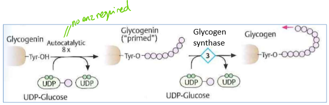 glycogen built on glycogenin enz as sugars added + build up around it
