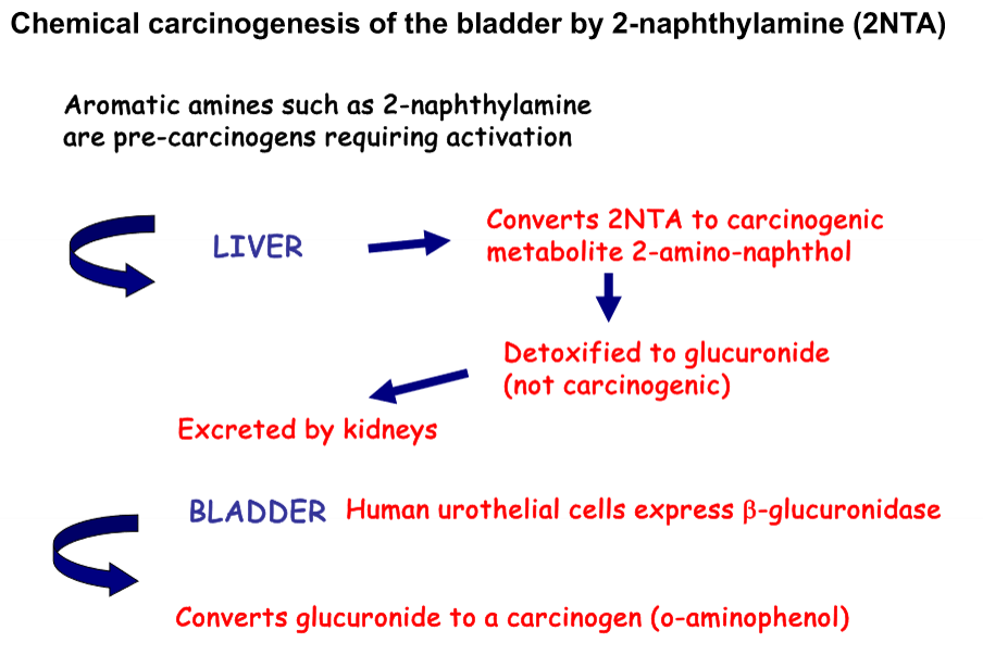 Outline the mechanisms of cancer induction in the bladder by napthylamine.