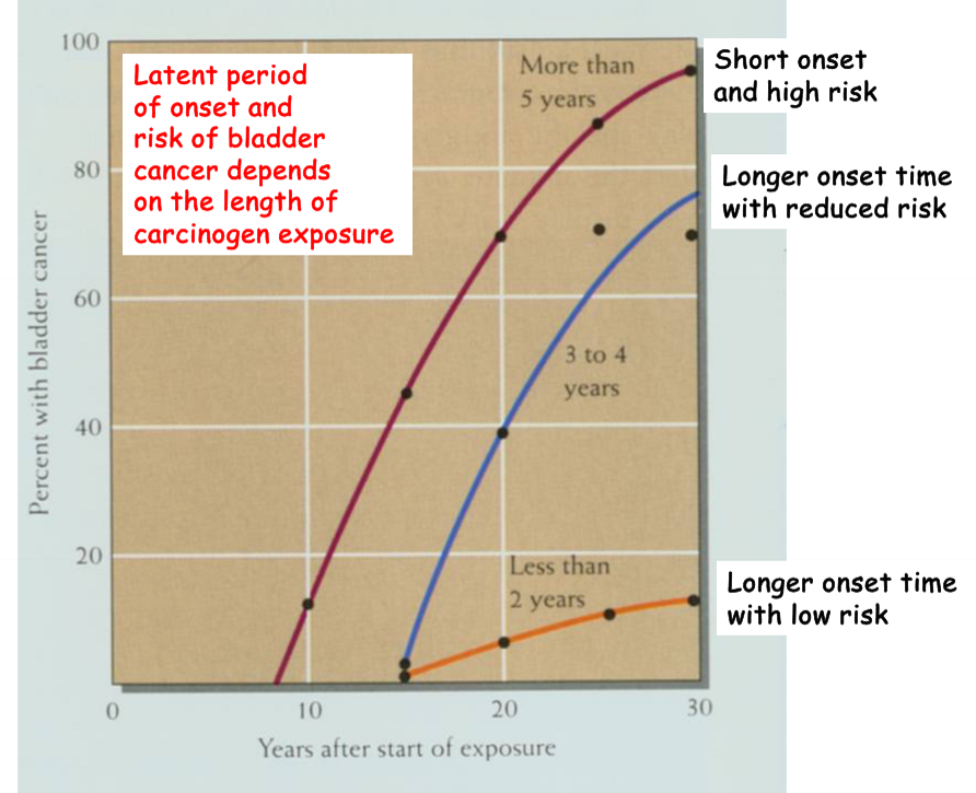 Describe the relationship between years after start of exposure to carcinogen and percentage with bladder cancer.