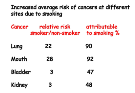 2) Appears to be a dose-response relationship between cigarette consumption and relative risk of developing lung cancer (smoking 10 cigarettes a day increases the risk x10 compared to non-smoker)