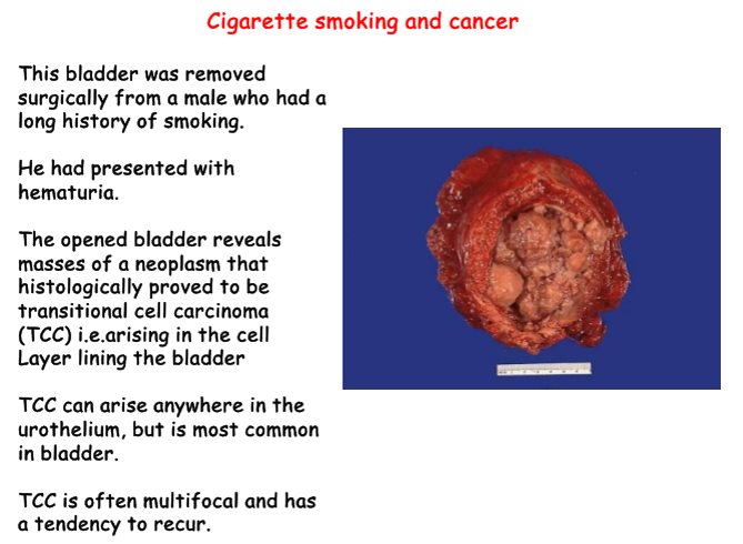 Describe the features of bladder cancer as a result of cigarette smoking.