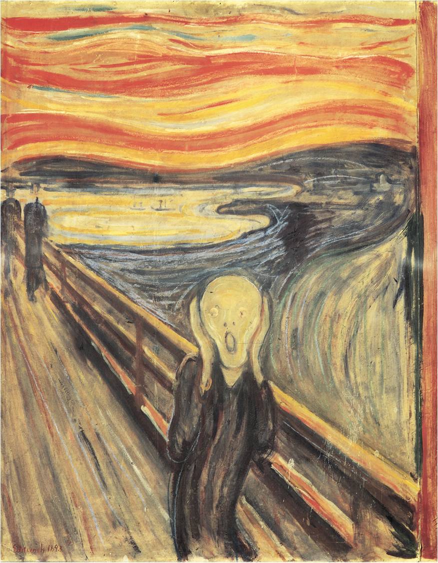 EDVARD MUNCH, The Scream, 1893. Tempura and pastels on cardboard, 2’ 11 3/4” x 2’ 5”. National Gallery, Oslo.