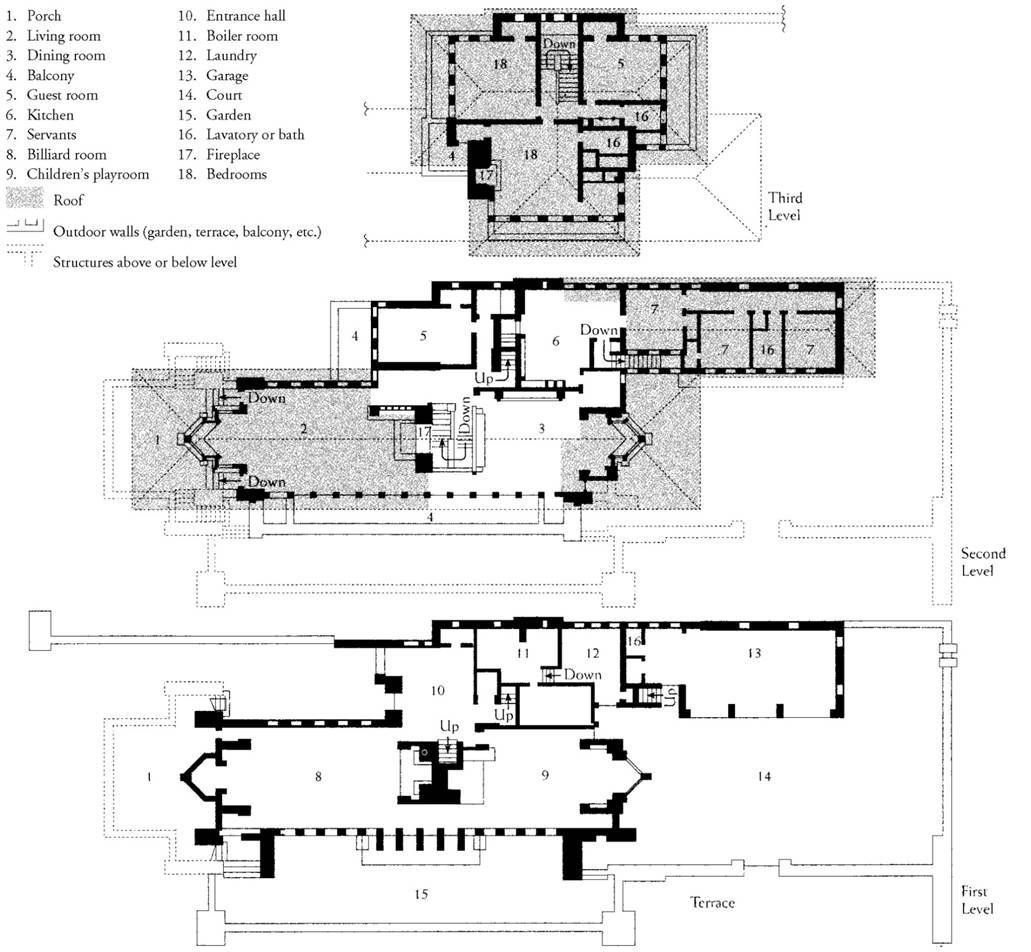 FRANK LLOYD WRIGHT, plan of the second (main) level of the Robie House, Chicago, Illinois, 1907–1909.