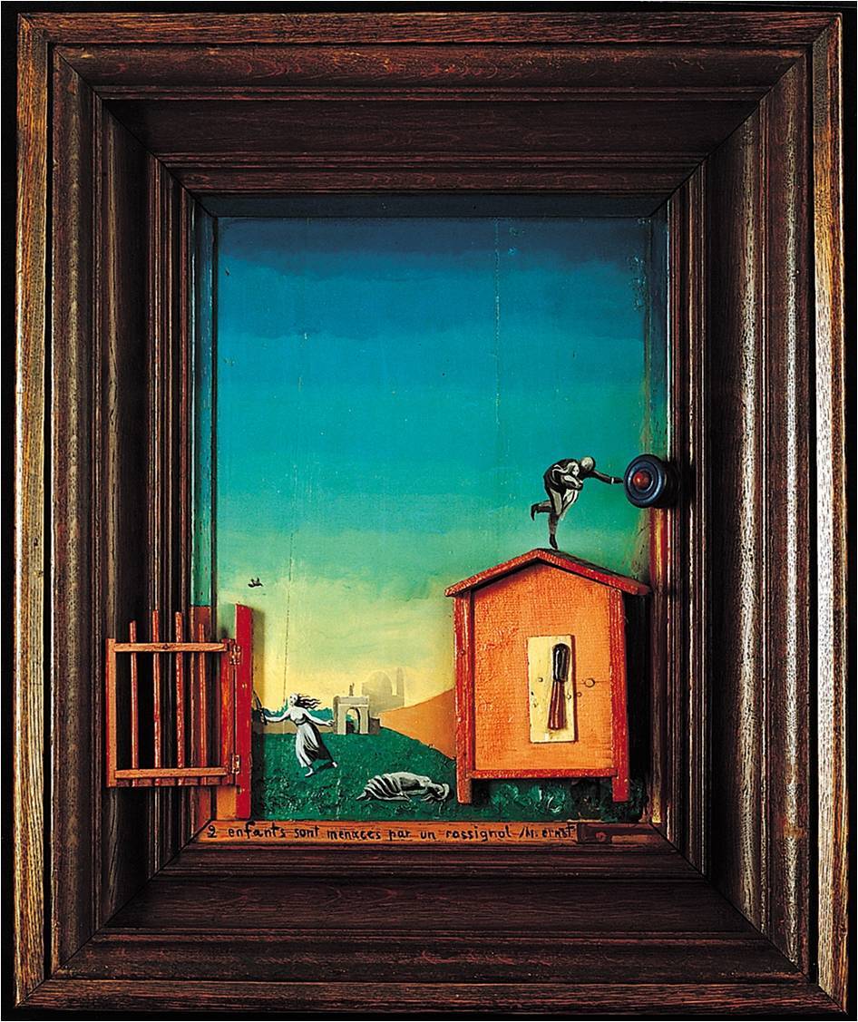 MAX ERNST, Two Children Are Threatened by a Nightingale, 1924. Oil on wood with wood construction, 2’ 3 1/2” x 1’ 10 1/2” x 4 1/2”. Museum of Modern Art, New York.