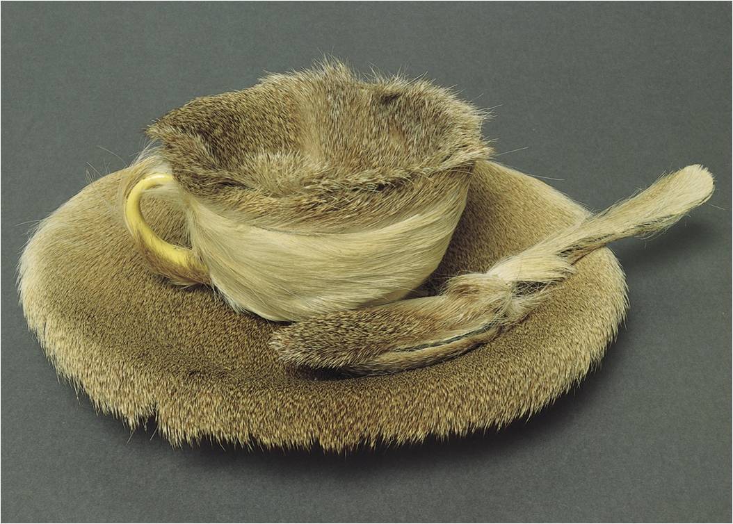 MERET OPPENHEIM, Object (Le Déjeuner en fourrure), 1936. Fur-covered cup, 4 3/8” diameter; saucer, 9 3/8” diameter; spoon, 8” long. Museum of Modern Art, New York.