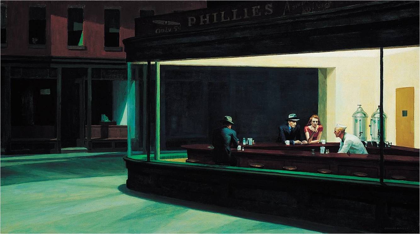 EDWARD HOPPER, Nighthawks, 1942. Oil on canvas, 2’ 6” x 4’ 8 11/16”. The Art Institute of Chicago, Chicago (Friends of American Art Collection).