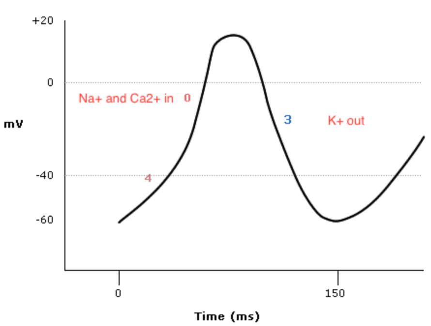 Influx of Na+ ions and Ca2+ to a smaller extent. Slow response action potential.