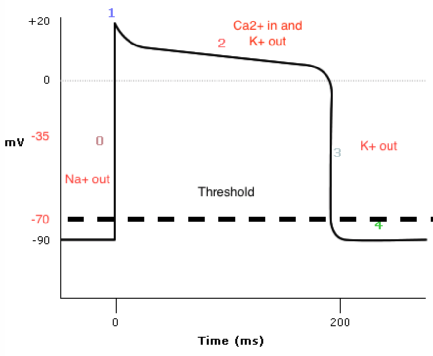 Stable diastolic potential. Maintained by differential permeability of membrane to K+ vs Na+ (100:1) and 3Na:2K ATP pump.