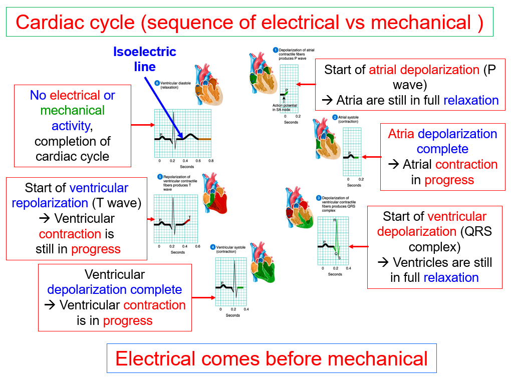 Describe the sequence of electrical vs. mechanical cardiac cycle