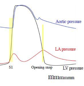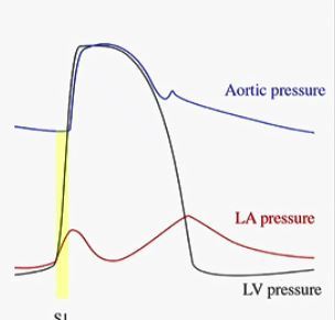 • LA volume and pressure remain elevated throughout the cardiac cycle
