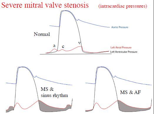 • In severe mitral stenosis, LA and LV pressure do not equilibrate and LV filling
