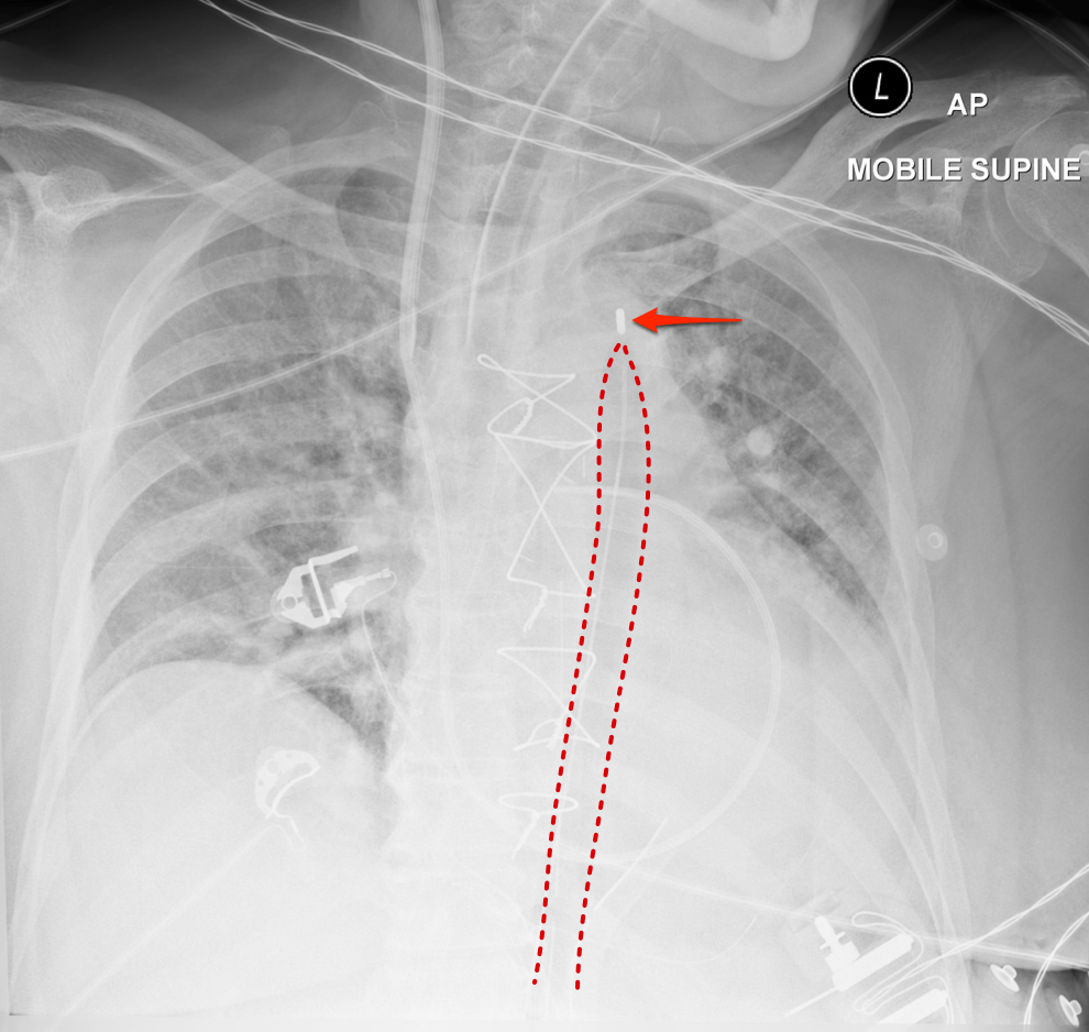 The balloon should be located in the proximal descending aorta, just below the origin of the left subclavian artery. On a chest radiograph, it should be at the level of the AP window. This ideally results in the balloon terminating just above the splanchnic vessels 3.