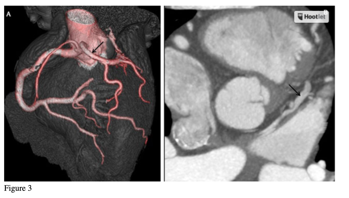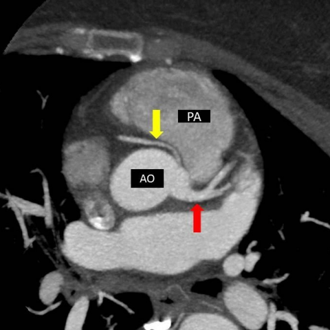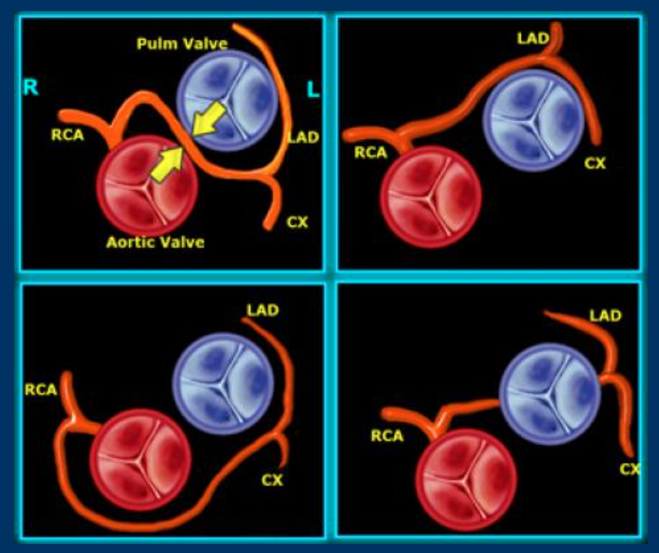 This interarterial course can lead to compression of the LCA (yellow arrows) resulting in myocardial ischemia.