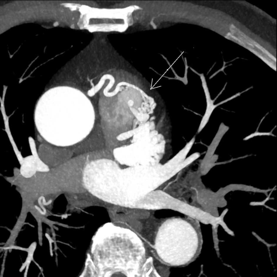 3a: Coronary CT angiography showing the origin of left main coronary artery (black arrow) from the right coronary sinus with prepulmonic course; 3b:Coronary CT angiography showing the anterior interventricular vein (black arrow) draining directly to the left atrium.