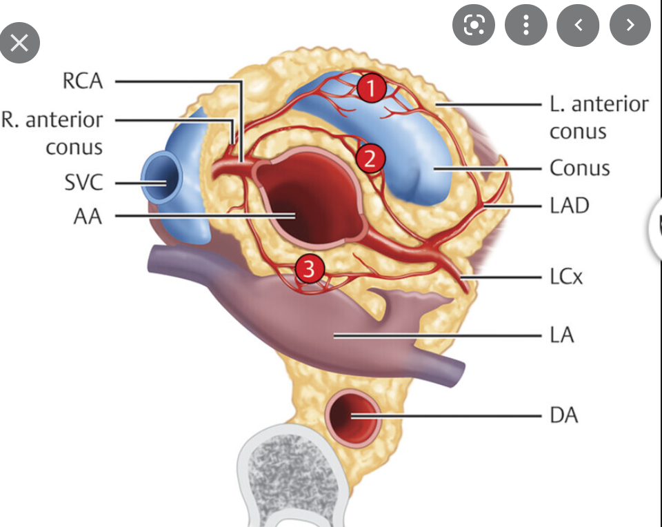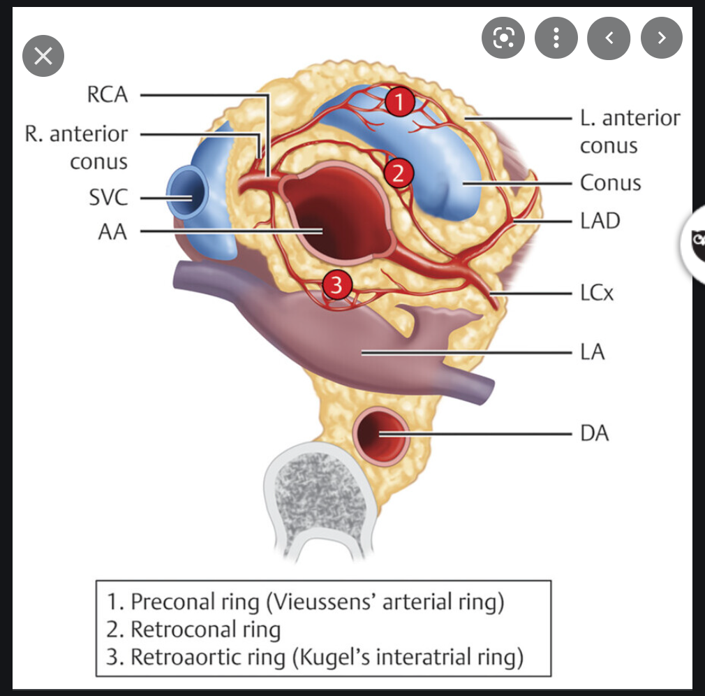 Vieussens ring: collateral branches from right conus artery to LAD.