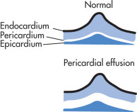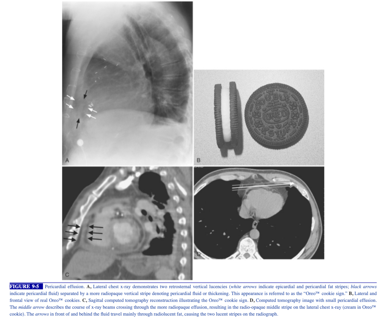 Vertical retrosternal opaque stripes representative of possible pericardial effusion (“oreo cookie sign”).