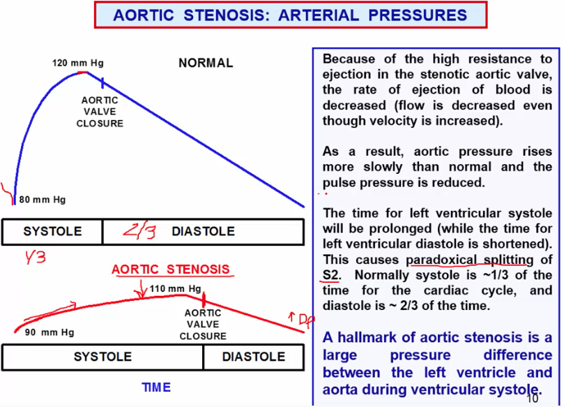 What happens to the blood pressure in aortic valve stenosis and how can you listen to aortic valve stenosis on a stethoscope