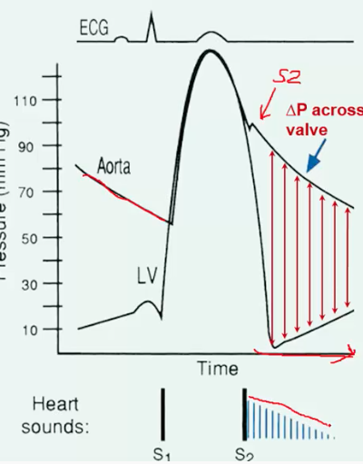 This murmur is heard the loudest when there is most flow of blood into the left ventricle which is during the beginning of diastole or when the valve just about closes. As the blood fills up left ventricle the mumur gets fainter and hence it is a decrescendo murmur which is heard on S2