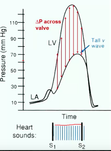 Pan systolic murmur, the backflow of blood from the leaky mitral valve will cause a constant murmur.