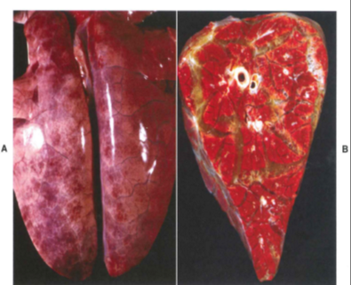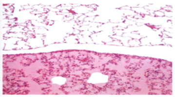 Lung; top is normal; bottom has pulmonary edema - protein-rich fluid filling alveoli and congested alveolar septa