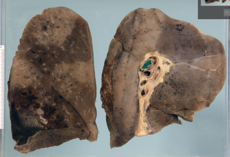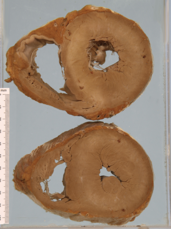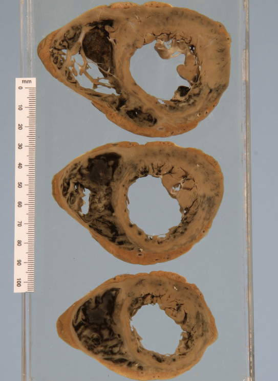 Severe myocardial ischaemia with multiple foci of old and recent infarction. Cardiac hypertrophy and dilatation.