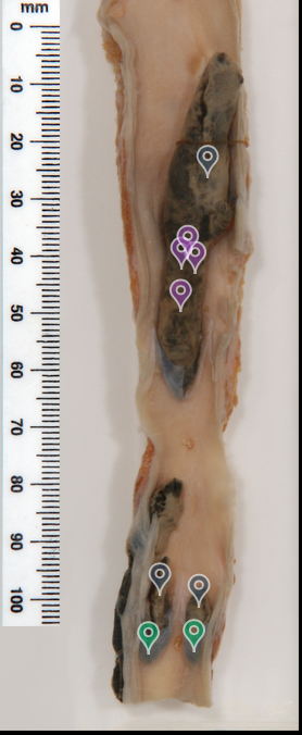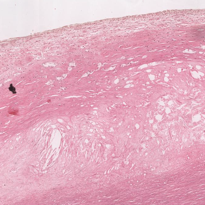 Atherosclerosis - cholesterol clefts, fibrous cap, foam cells, lipid deposits