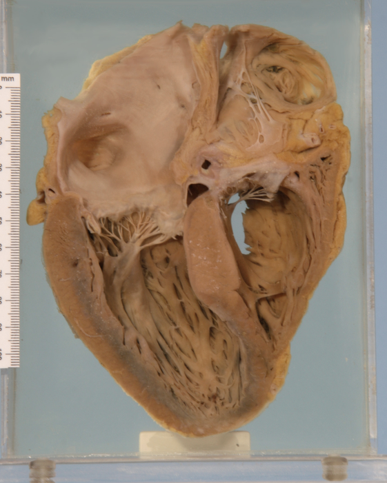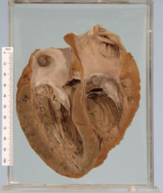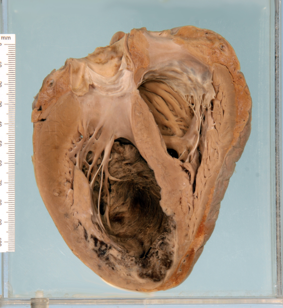 Organising anteroseptal transmural myocardial infarct with biventricular dilatation and thrombosis