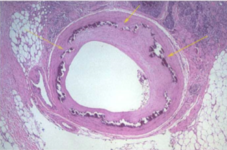 Monkeburg arterioloscerosis - calcification in media due to ageing