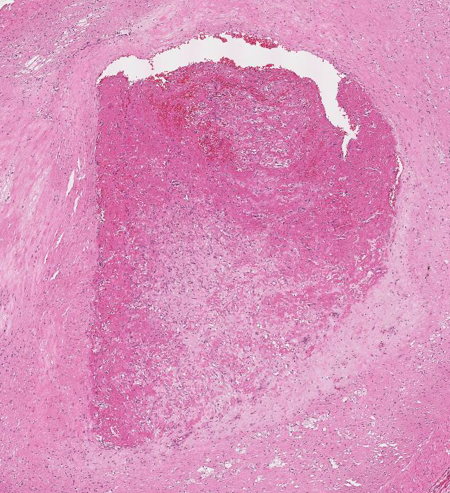 Atherosclerotic plaque complicated by the formation of an occlusive thrombosis in the vessel. The thrombosis is reorganising. It is likely to be due to rupture of the plaque.