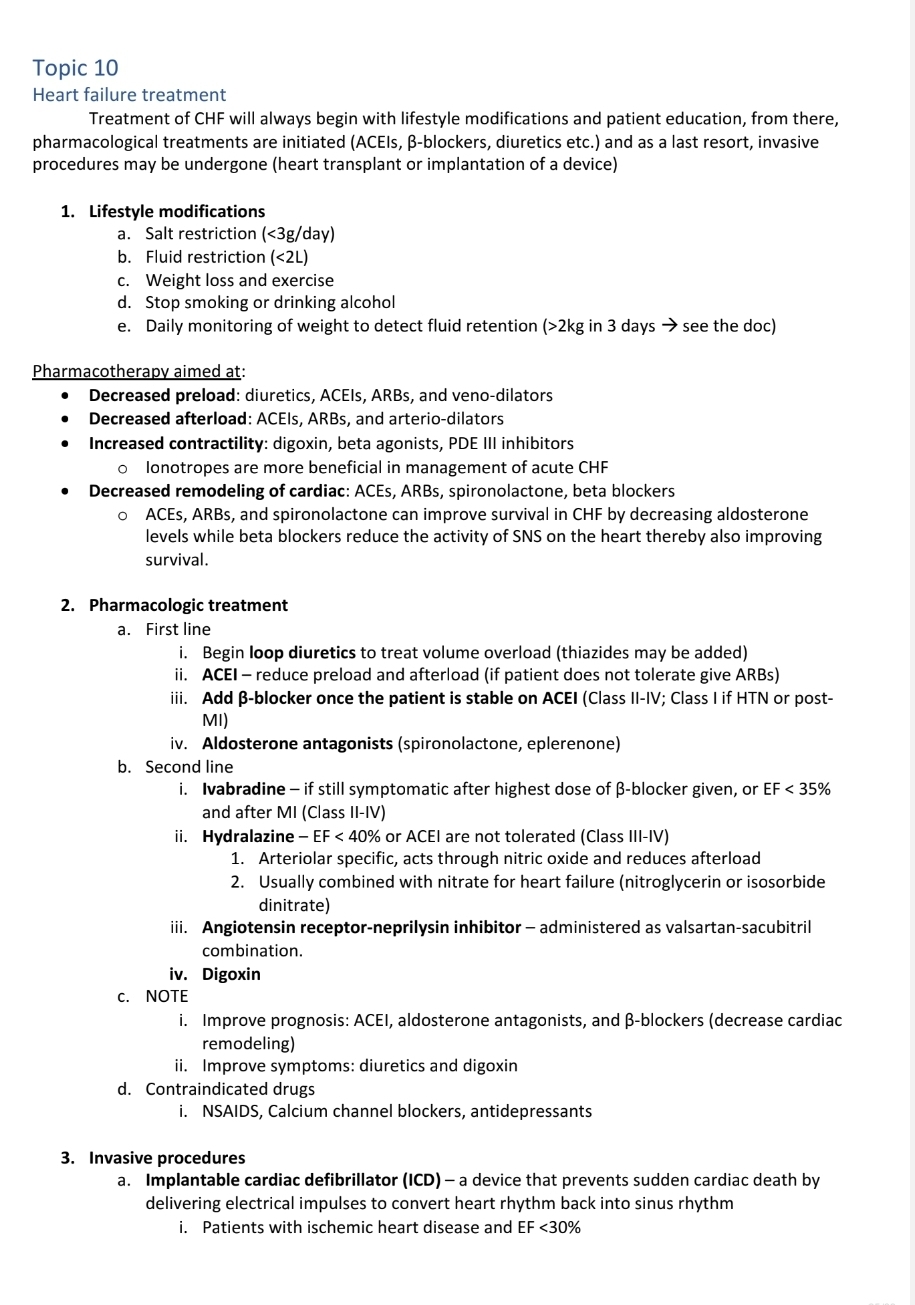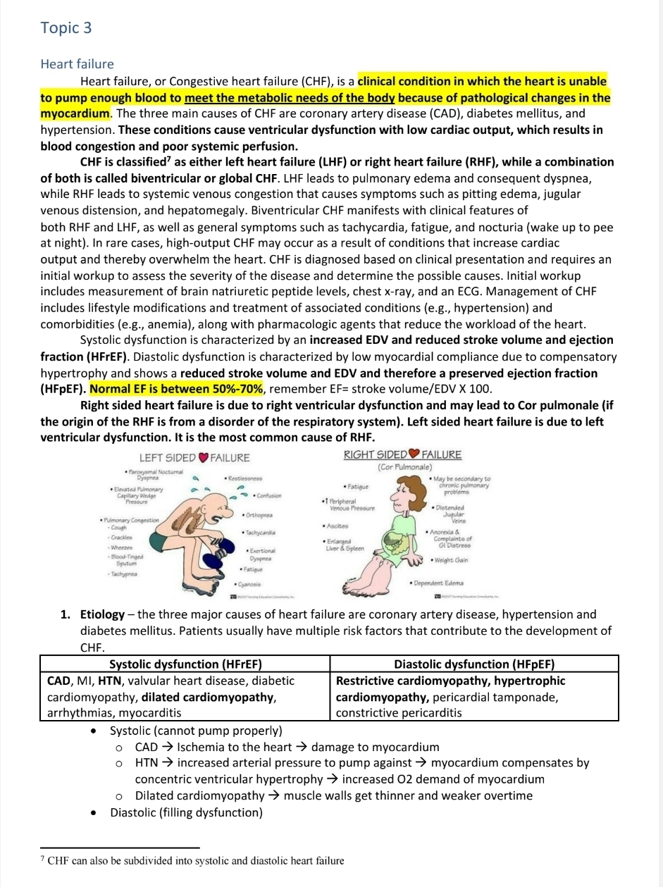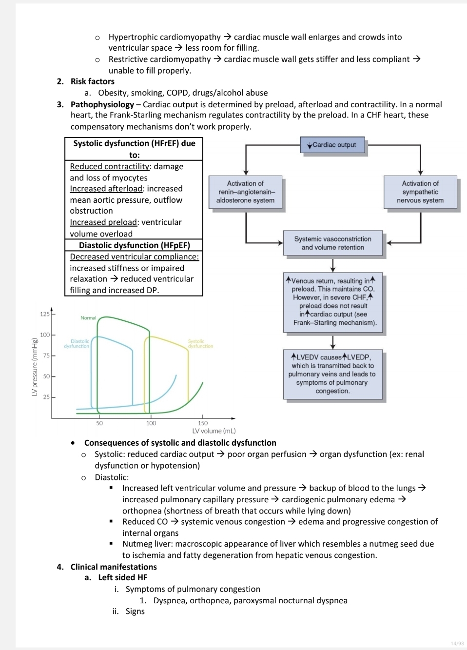 Heart failure (common causes, pathophysiology, clinical manifestations, stages).