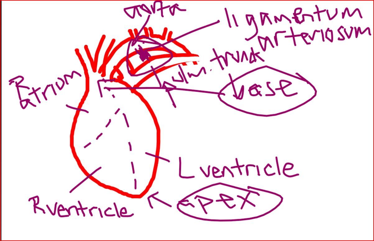 Base of heart - is the point of attachment to the vessels, rest of heart is sitting on fluid and tissues which stabilize it where it belongs.