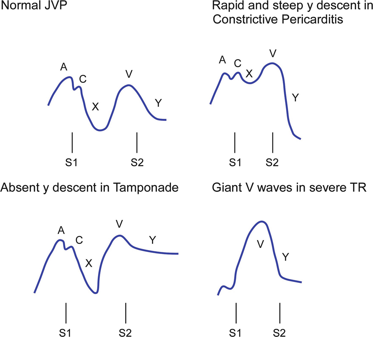 kussmaul’s sign: raised JVP on inspiration and drops with expiration