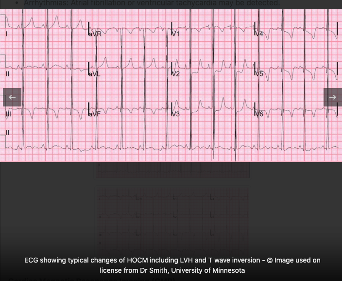 - Deep, symmetric T-wave inversions in the precordial leads are suggestive of HOCM.