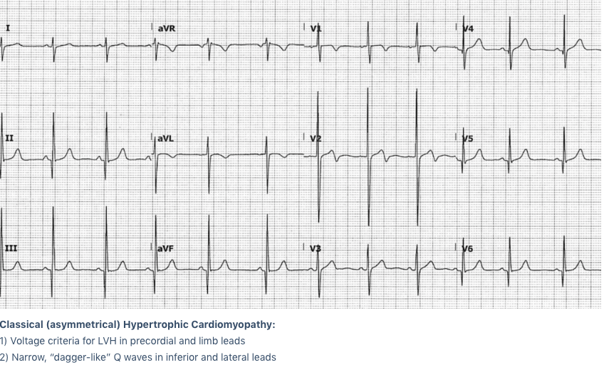 - Deep, narrow (“dagger-like”) Q waves in lateral (I, aVL, V5-6) +/- inferior (II, III, aVF) leads