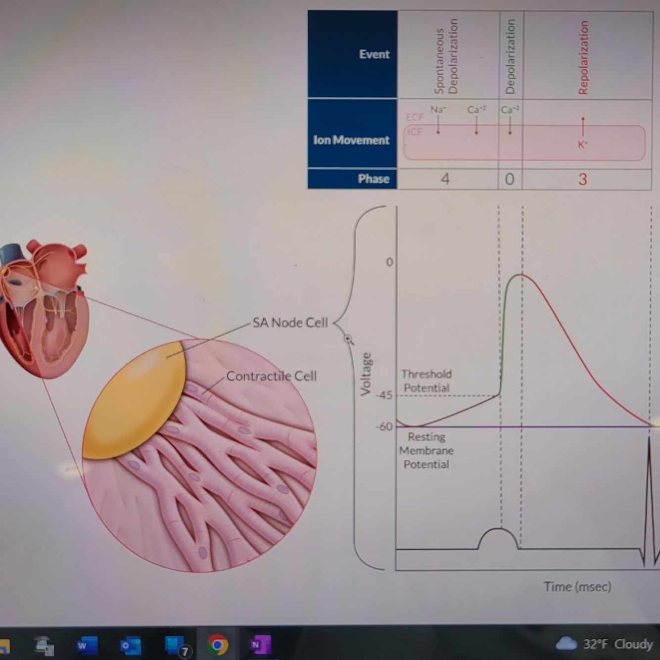 Phase 4: Spontaneous depolarization -> leaky to Na+ (Ca+2 influx occurs at the very end of phase 4)
