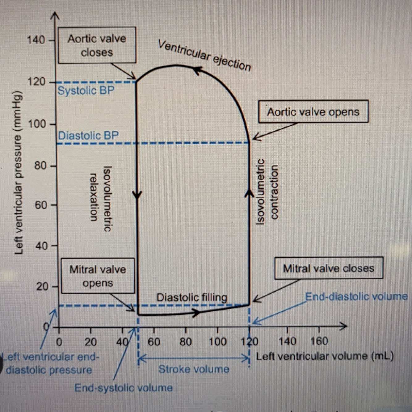 Relate the 6 stages of the cardiac cycle to the LV pressure-volume loop