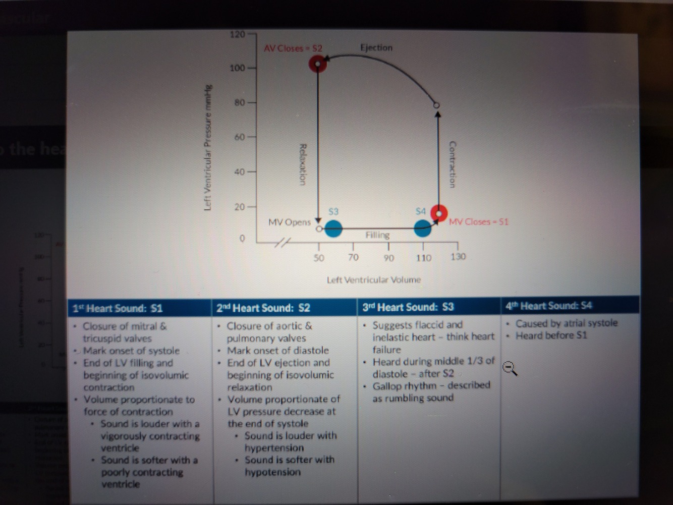Where do the heart sounds match up on the left ventricle pressure volume loop?